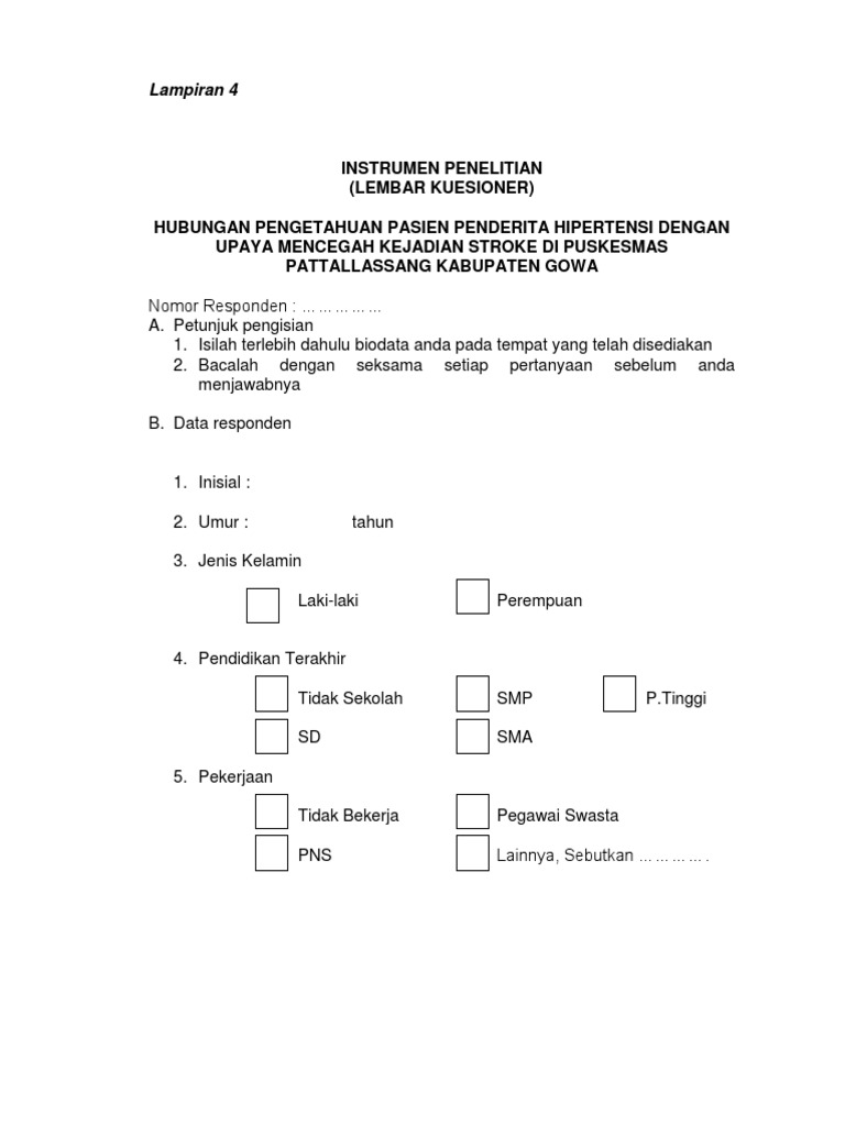 Contoh Lembar Kuesioner Untuk Stroke By Da_Kadence13 01 Jun, 2022 Post a Comment Lampiran 1 Lembar Persetujuan Menjadi Responden Lembar Kuesioner Pdf Kuesioner Penelitian Pdf Top Pdf Lampiran Informed Consent Dan Kuesioner Penelitian Lembar Penjelasan Kepada Calon Subjek Penelitian 123dok Com Contoh Kuesioner Hipertensi Pdf Share No comments for "Contoh Lembar Kuesioner Untuk Stroke"